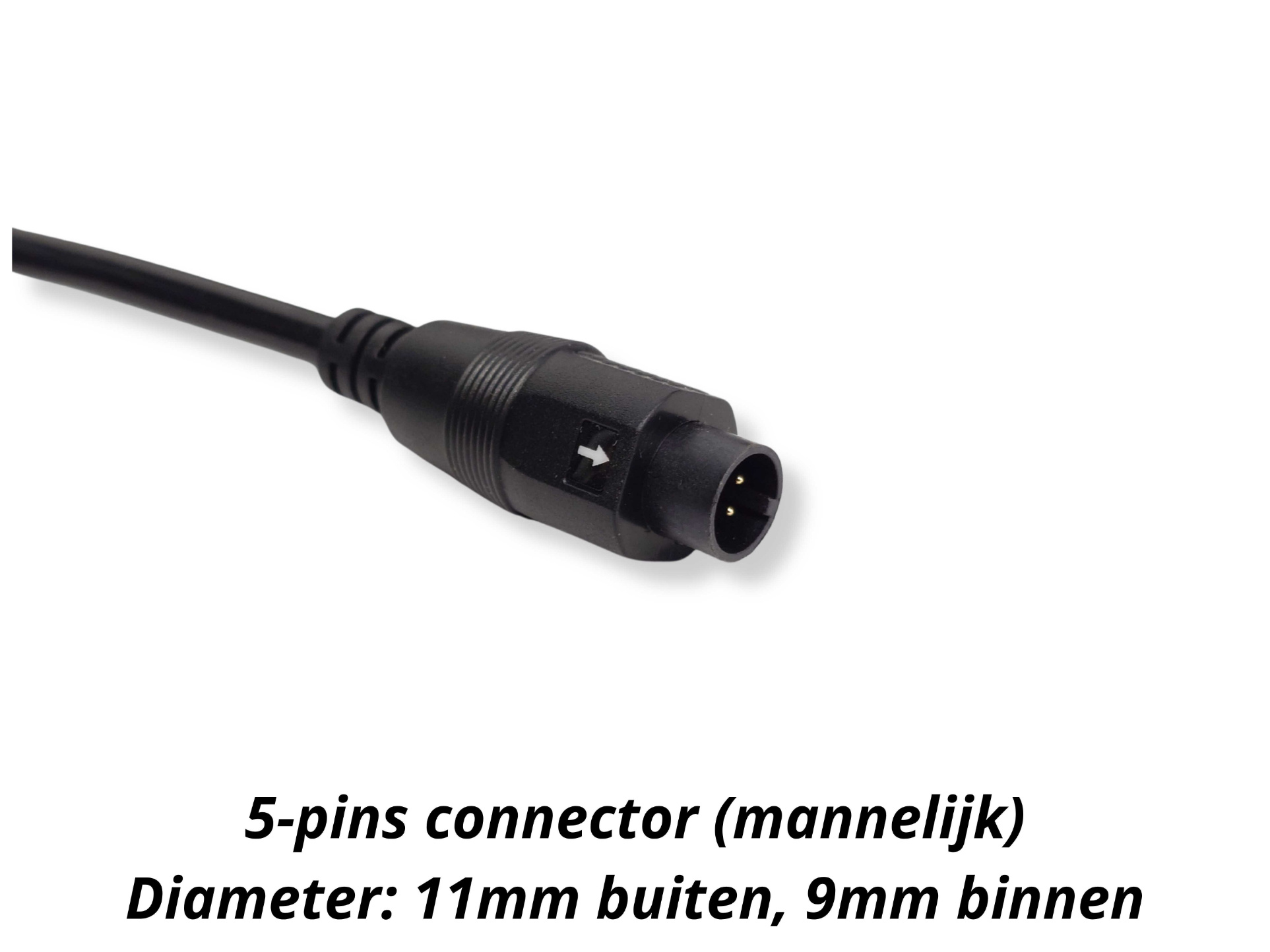 Oplader Ecomo met een output van 42V, 2A met ronde 5-pins connector is geschikt voor 36V Pylion Joycube accu’s.