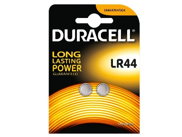 2x Duracell LR44 Alkaline knoopcel (105mAh, 1,5V). 12mm diameter. 5mm dik. Geschikt voor rekenmachines en ander electronisch apparatuur. LET OP: Gebruik voor een horloge nooit een alkaline batterij