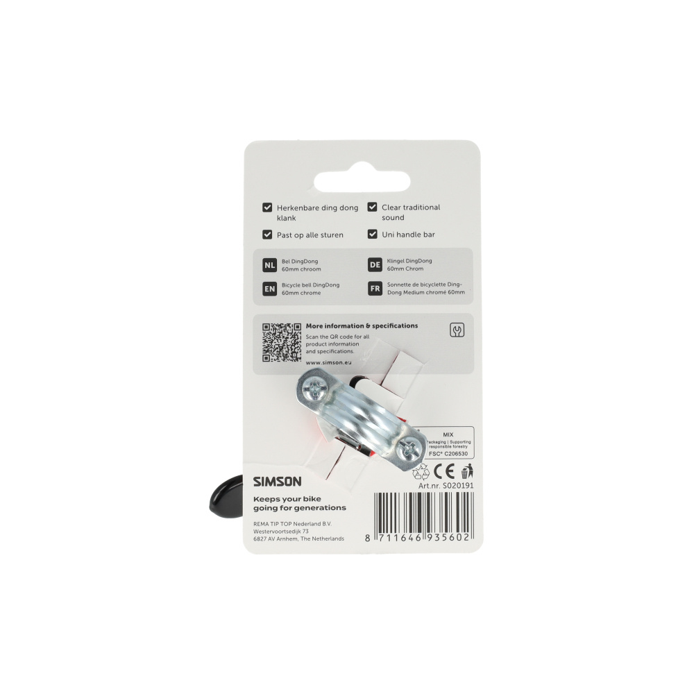 Geef je fiets een stem met de klassieke DingDong. De Simson Bel DingDong Medium in chroom combineert een nostalgisch design met de onmiskenbare, vrolijke dubbelklank. Met een diameter van 60mm is dit de ideale middenweg: compact genoeg voor je stuur, maar luid genoeg om op een vriendelijke manier ruimte te maken in het drukke verkeer. De hoogwaardige chromen afwerking zorgt ervoor dat jouw fiets generaties lang zijn glans behoudt.