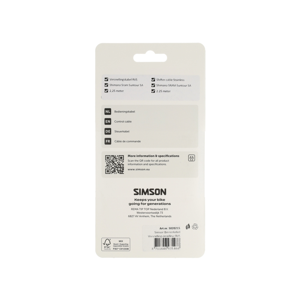 De Simson Versnelling Binnenkabel Derailleur is de ideale vervanging voor versleten of gerekte kabels. Dankzij de ruime lengte van 2,25 meter is deze kabel geschikt voor zowel voor- als achterderailleurs. De kabel is vervaardigd uit hoogwaardig roestvrijstaal (RVS), wat rek minimaliseert en corrosie voorkomt. Voorzien van zowel een ton- als peernippel, waardoor de kabel compatibel is met vrijwel alle schakelsystemen van Shimano, SRAM, Suntour en meer.