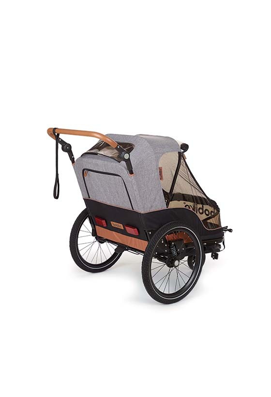 De Bobike Trailer is een multifunctionele fietskar die kan worden gebruikt als fietskar of wandelwagen.
