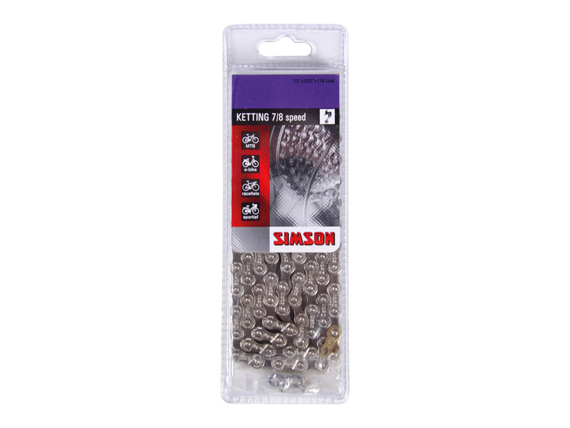 De Simson Ketting Derailleur 7/8 is een kwalitatief hoogwaardige fietsketting geschikt voor fietsen met 7 of 8 (IG/HG) derailleurversnellingen. Deze ketting heeft 116 schakels en een maat van 1/2"x 3/32".