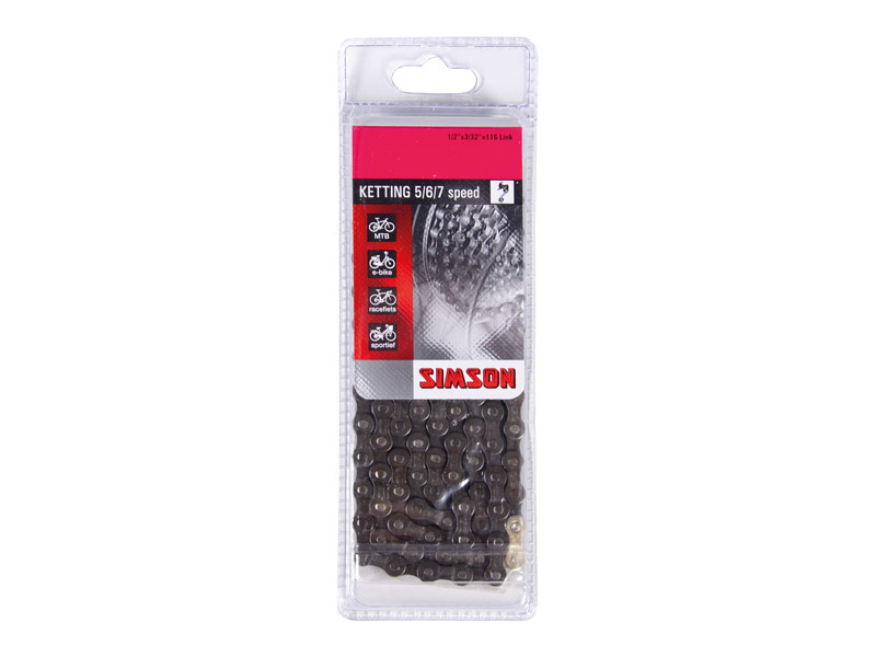 De Simson Ketting Derailleur 5/6/7 is een kwalitatief hoogwaardige fietsketting geschikt voor fietsen met 5, 6 of 7 (UG) derailleurversnellingen. Deze ketting heeft 116 schakels en een maat van 1/2"x 3/32".