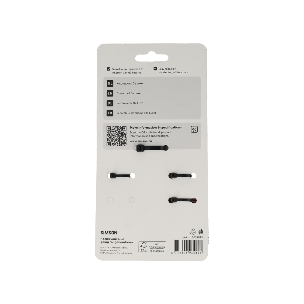 Moeiteloos je ketting inkorten of repareren. De Simson Kettingpons De Luxe is een krachtig en robuust gereedschap, ontworpen voor zowel de thuisklusser als de professional. Dankzij de extra grote hefboomarm heb je aanzienlijk minder kracht nodig om de kettingpennen nauwkeurig naar buiten te drukken. Geschikt voor vrijwel iedere fietsketting en onmisbaar bij het vervangen of herstellen van je aandrijving.
