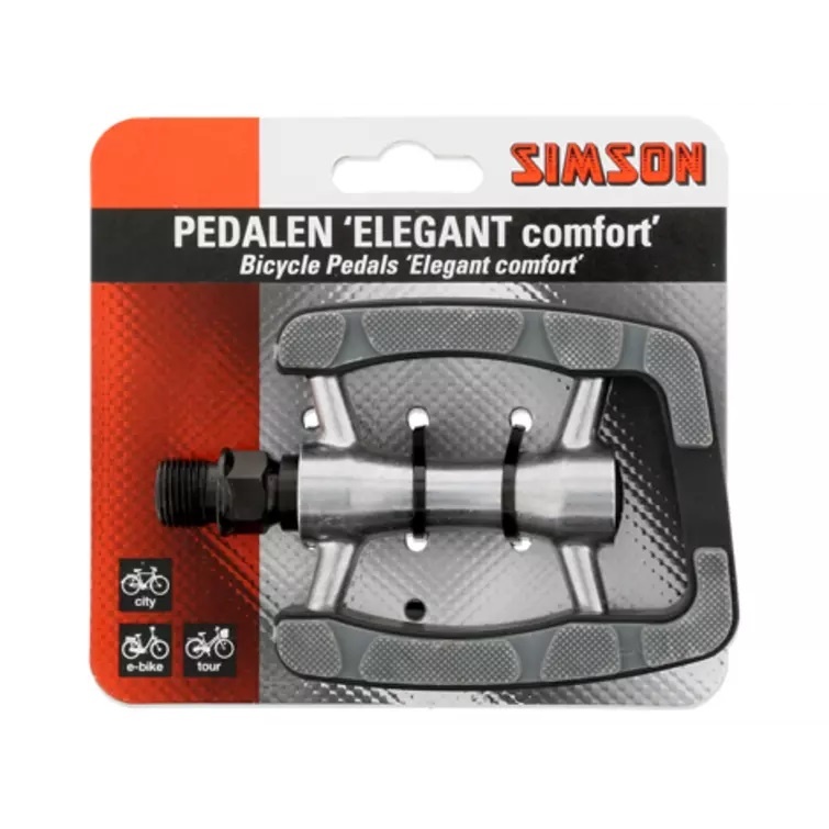 De Simson Pedalen Elegant comfort zijn geschikt voor vrijwel iedere fiets, maar met name populair bij de sportieve fietser met stads-, tour- en E-bike fiets. De pedalen van aluminium hebben reflectoren en een grijze kunststof anti-slip laag voor optimale grip. De pedalen hebben zijn te monteren met behulp van een Simson Pedaalsleutel.