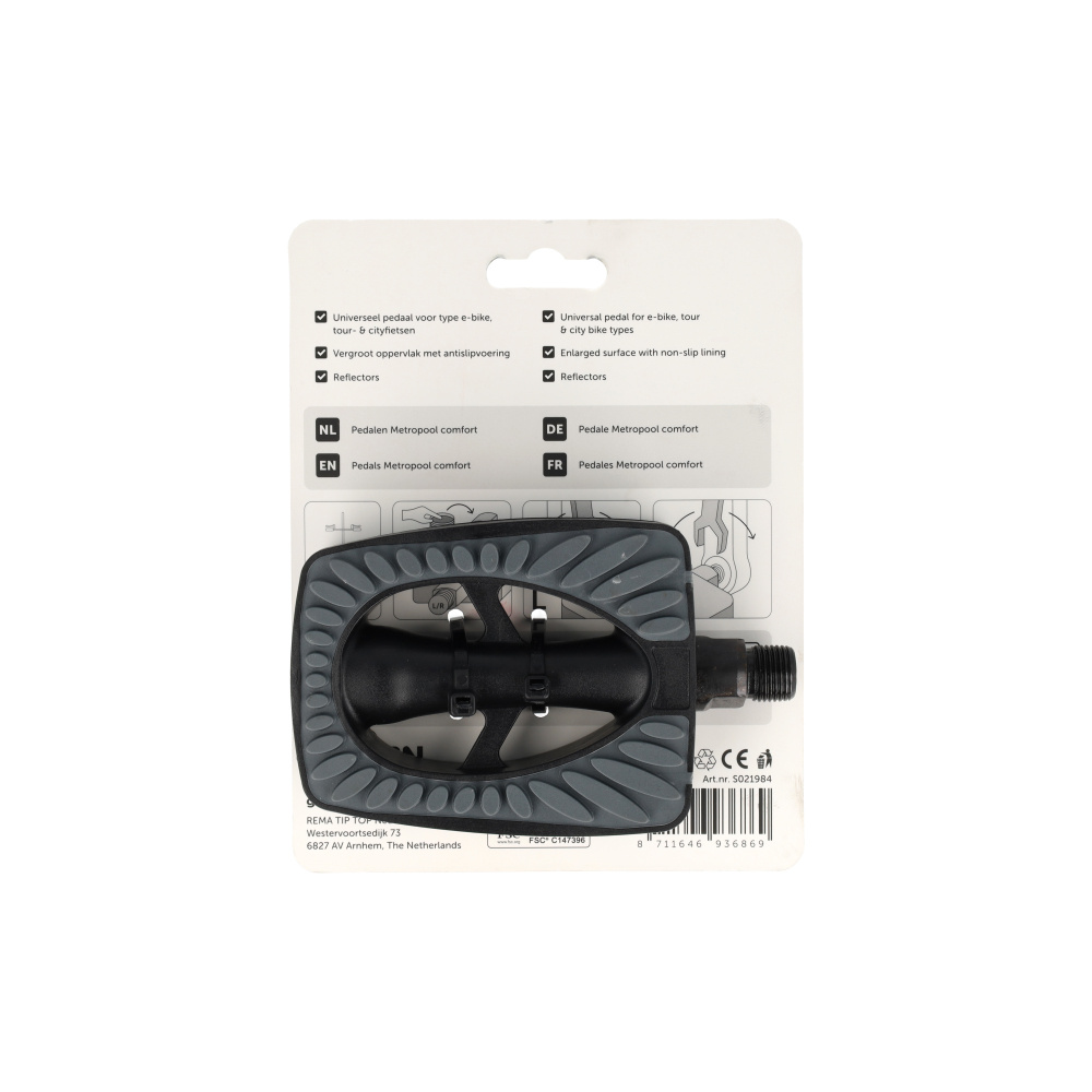 De alleskunner voor dagelijks rijplezier. Of je nu op een omafiets, tourfiets of e-bike rijdt, de Metropool Comfort pedalen bieden altijd de juiste ondersteuning. Dankzij de grijze kunststof antislip-laag heb je onder alle weersomstandigheden een stabiele houding. Een betrouwbaar, universeel pedaal met soepele lagers voor een aangename trapbeweging.