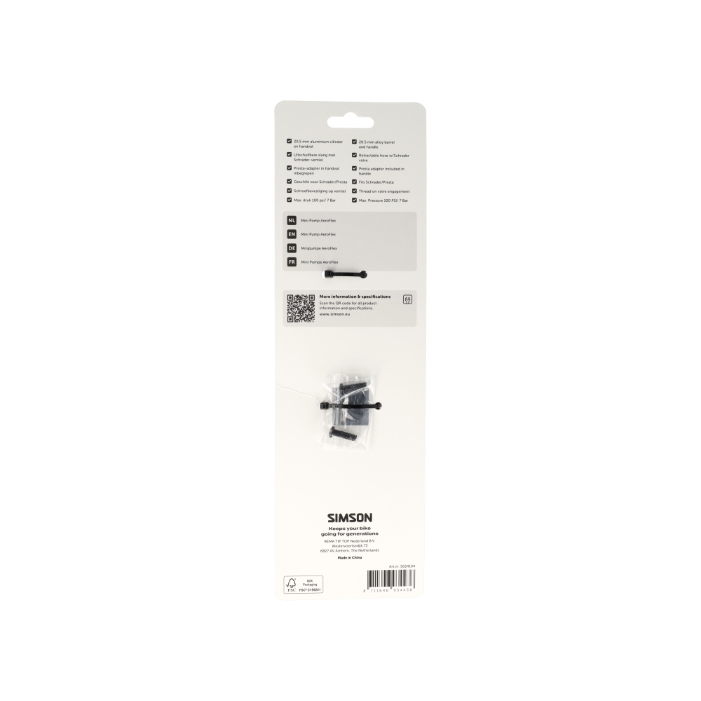 De Simson Minipomo AeroFlex is de ideale metgezel voor elke fietstocht. Deze minipomp is voorzien van een slimme, uitschuifbare slang die de druk op het ventiel vermindert tijdens het pompen, waardoor schade aan het ventiel wordt voorkomen. De robuuste 20,5 mm aluminium cilinder levert een indrukwekkende druk tot 7 Bar (100 psi). Met de in het handvat verborgen Presta-adapter wissel je moeiteloos tussen verschillende ventieltypen.
