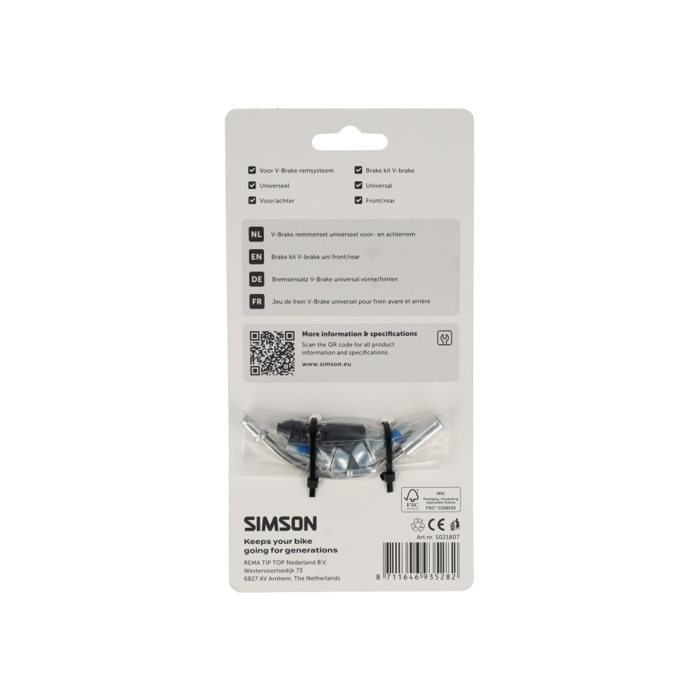 Deze complete Simson V-Brake set is de ideale vervanging voor versleten remsystemen. De set is universeel en kan zowel op de voorvork als de achtervork gemonteerd worden. Dankzij de meegeleverde remblokken, kabelgeleider (pipe) en bevestigingsmaterialen heb je alles in huis voor een veilige upgrade van je remprestaties.