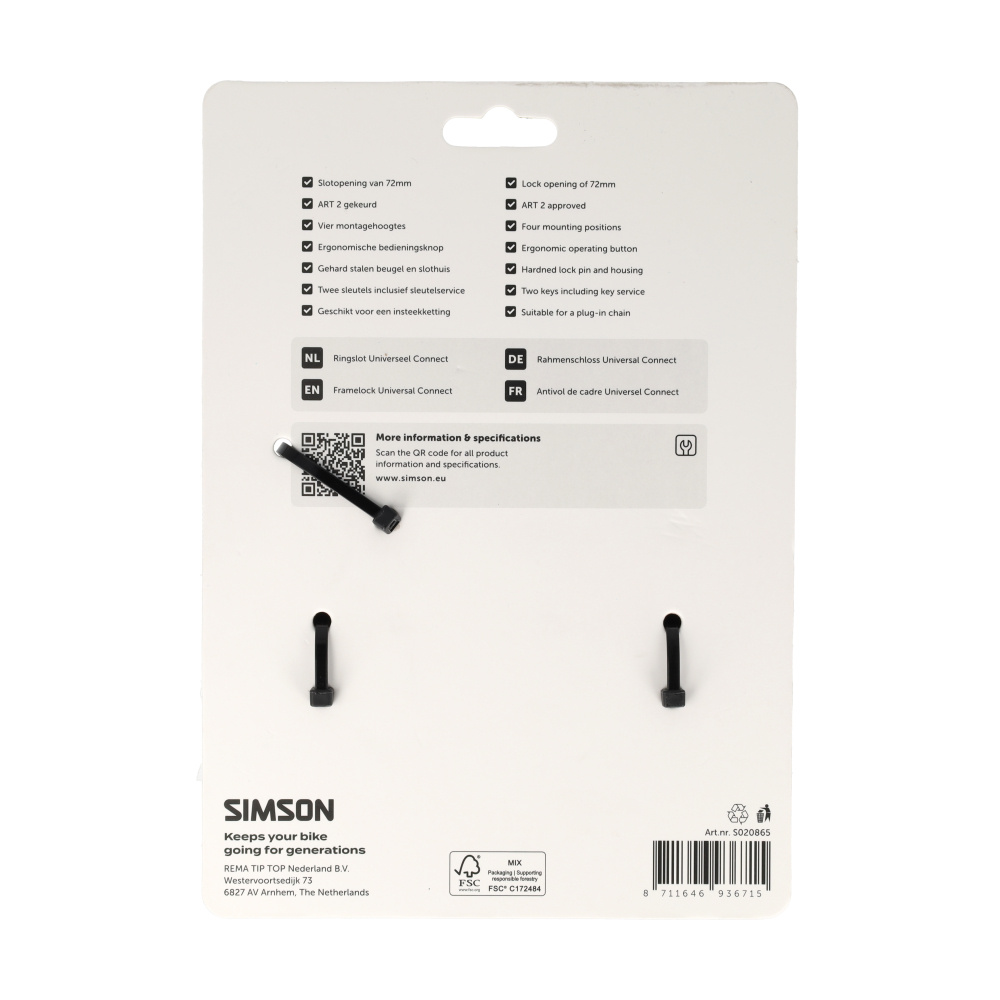 Dubbele veiligheid met plug-in optie. Het Universeel Connect frameslot biedt niet alleen een ART2-gecertificeerde beveiliging, maar heeft ook een zijwaartse ingang voor een insteekketting. Dankzij de anti-boor cilinder en de gehard stalen beugel (Security Level 13) staat je fiets altijd veilig. Geschikt voor banden tot 72 mm breed.