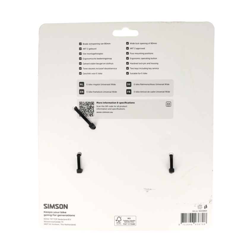 De perfecte match voor brede banden en e-bikes. De Simson Universeel Wide is speciaal ontworpen voor moderne fietsen met brede banden (tot 88 mm). Met een Simson Security Level van 13 en een ART2-sterren keurmerk voldoet dit slot aan alle eisen voor een fietsverzekering. De extra brede doorgang maakt hem uitermate geschikt voor elektrische fietsen en fatbikes.