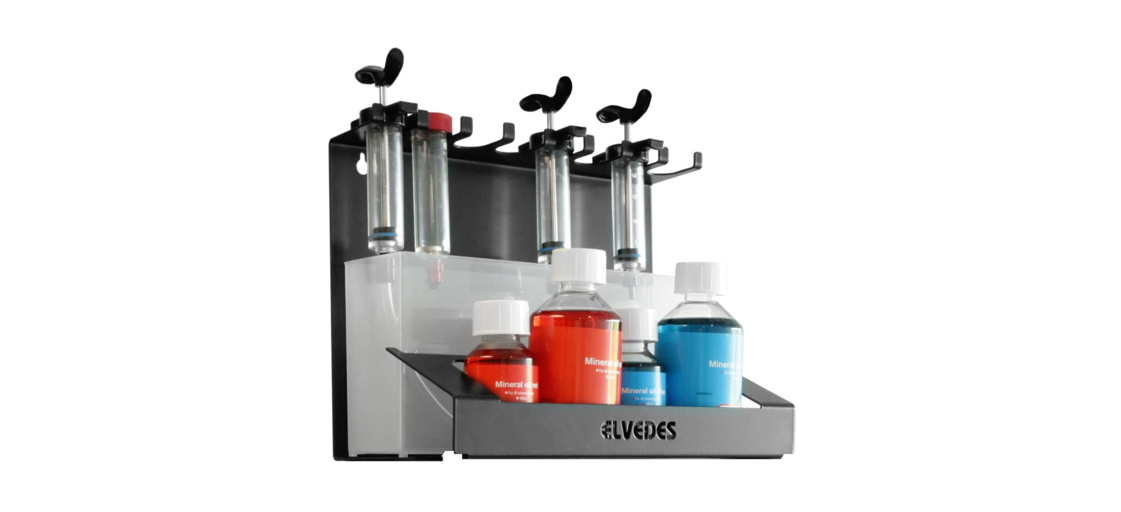 De spuiten uit de professionele ontluchtingsset kunnen nu ook gevuld worden bewaard. Het Syringe Station biedt plaats aan 8 spuiten en maximaal 4 flessen DOT-vloeistof of minerale olie.
