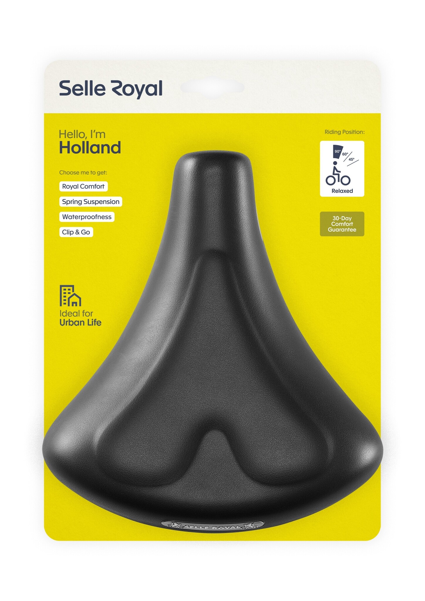 Tijdloze stijl met modern comfort in de Holland. De Holland zit vaak op klassieke Nederlandse fietsen en is een opvallend zadel met een retro-design. Een stijlvol uiterlijk hoeft niet ten koste te gaan van het comfort, want de Holland heeft een springvering om schokken te dempen. Samen met een laag Royalgel™ garandeert dit optimale drukverlichting.